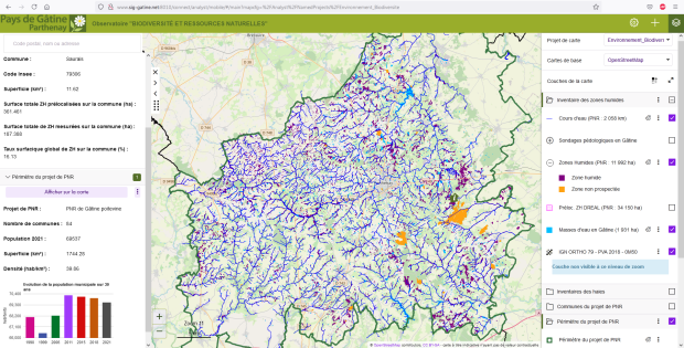 L'objectif de l'observatoire cartographique du territoire de Gâtine est de poursuivre l'accompagnement des besoins de connaissances dans toutes les thématiques du projet de Parc naturel régional de Gâtine poitevine et d'engager de nouvelles pistes de travail, au regard des orientations données par nos partenaires et financeurs (économie, attractivité, etc.). De nombreuses données sont ainsi collectées et partagées.